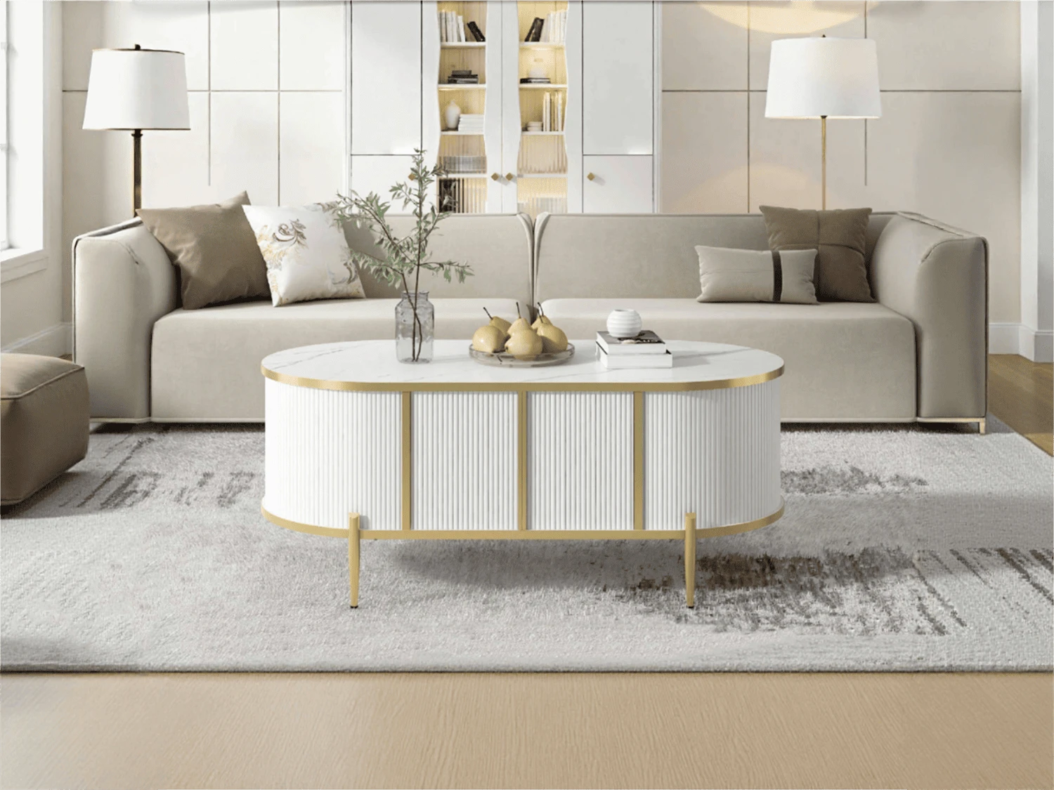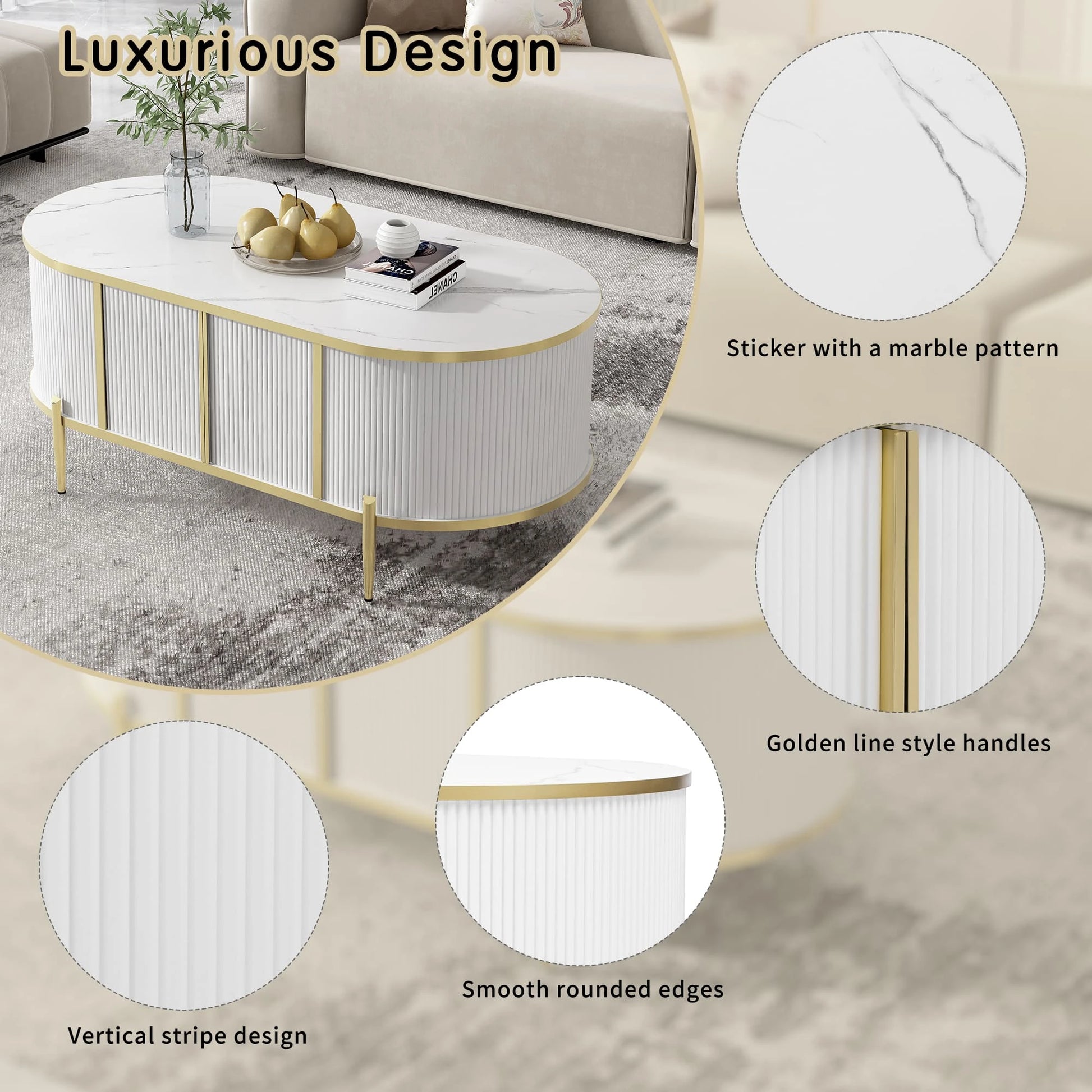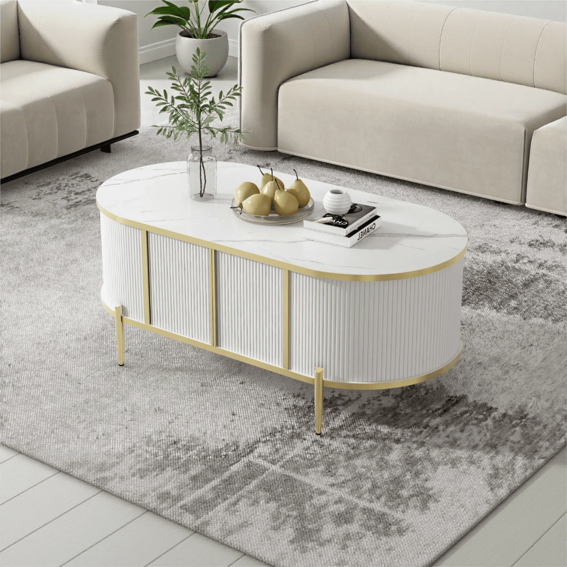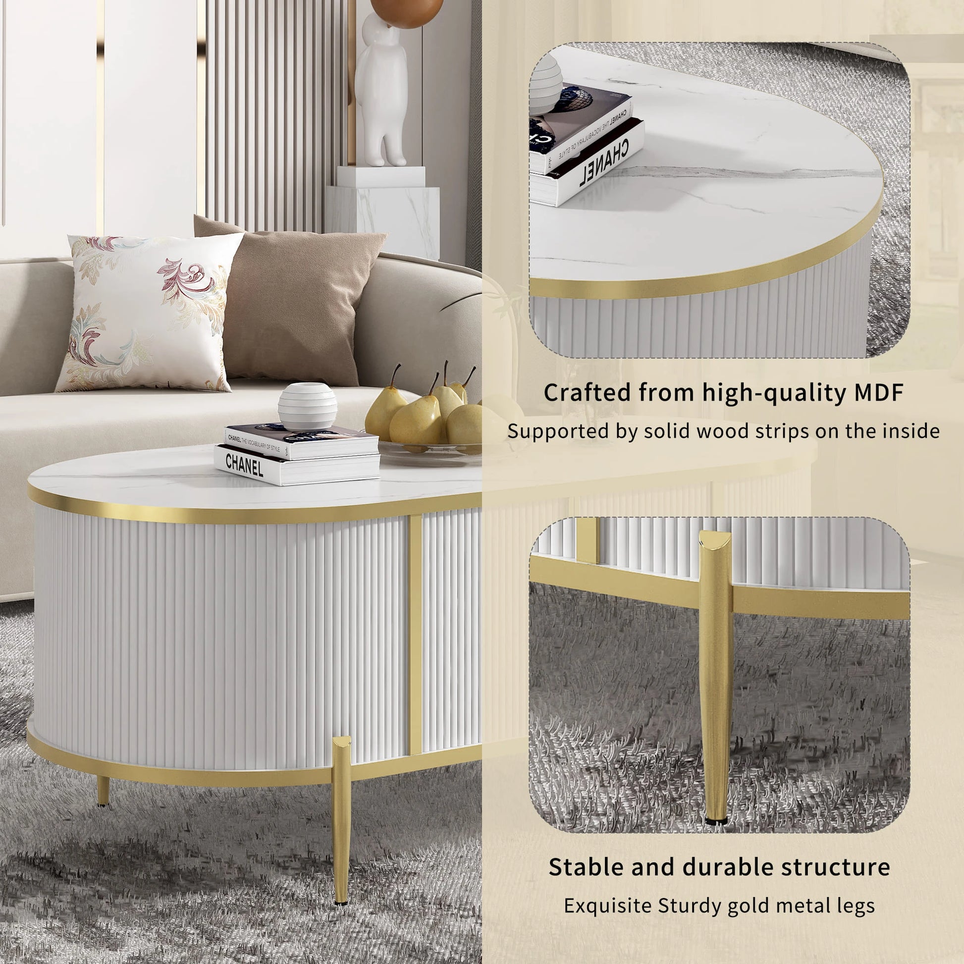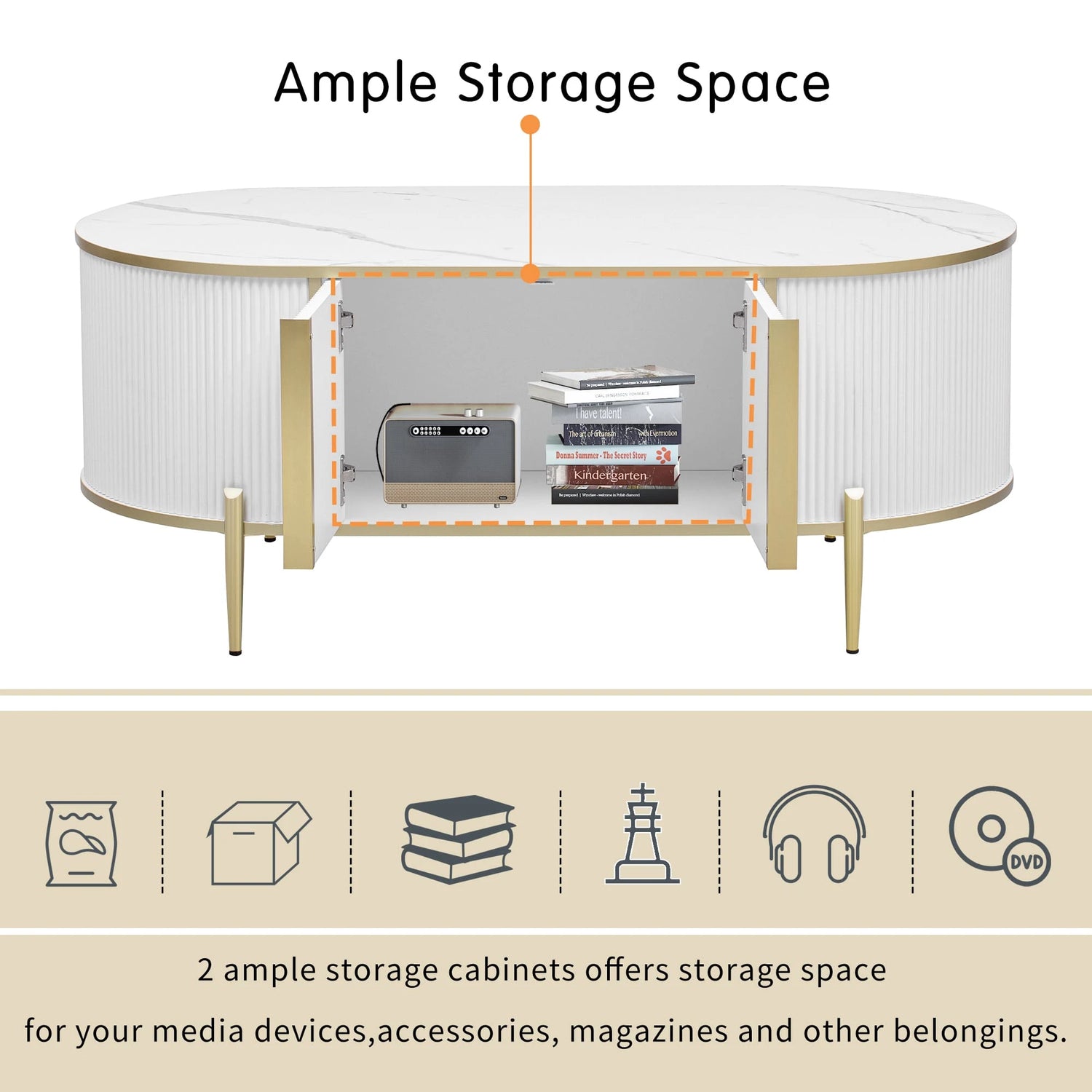 This modern oval coffee table features a marble-patterned top, fluted body design, and gold accents for a luxurious touch. Equipped with 2 spacious storage cabinets with metal hinged doors and supported by sturdy gold metal legs with non-slip pads, it combines elegance, practicality, and safety for any living space.